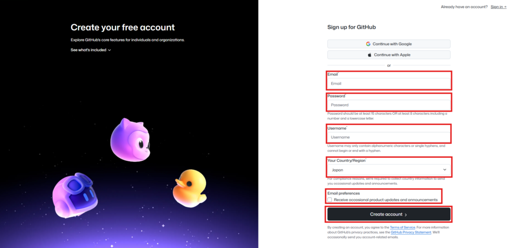 赤枠部分の必要な情報を入力後、利用規約をチェックし、「Create account」をクリックします。