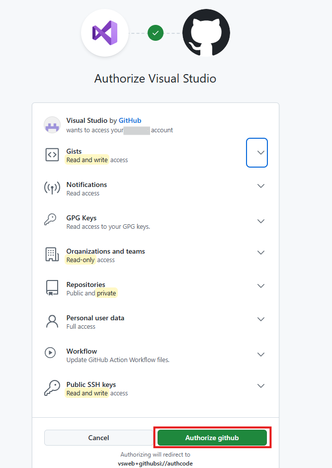 GitHubアカウントとVisualStudioの連携を承認する