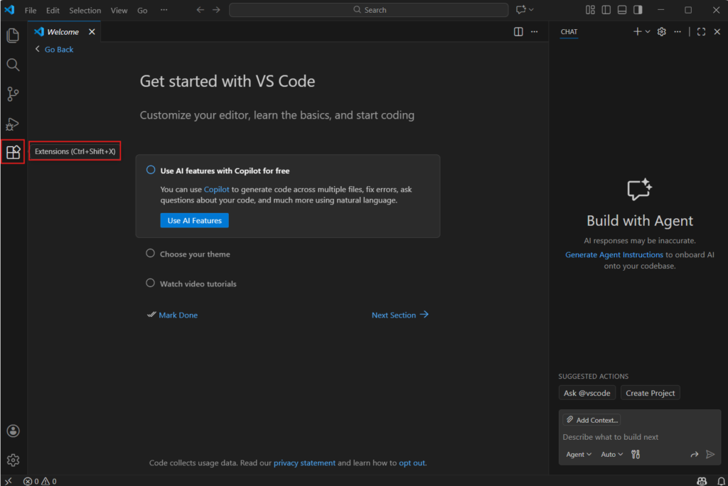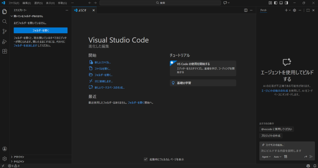 デスクトップやスタートメニューからVisual Studio Code を起動します。