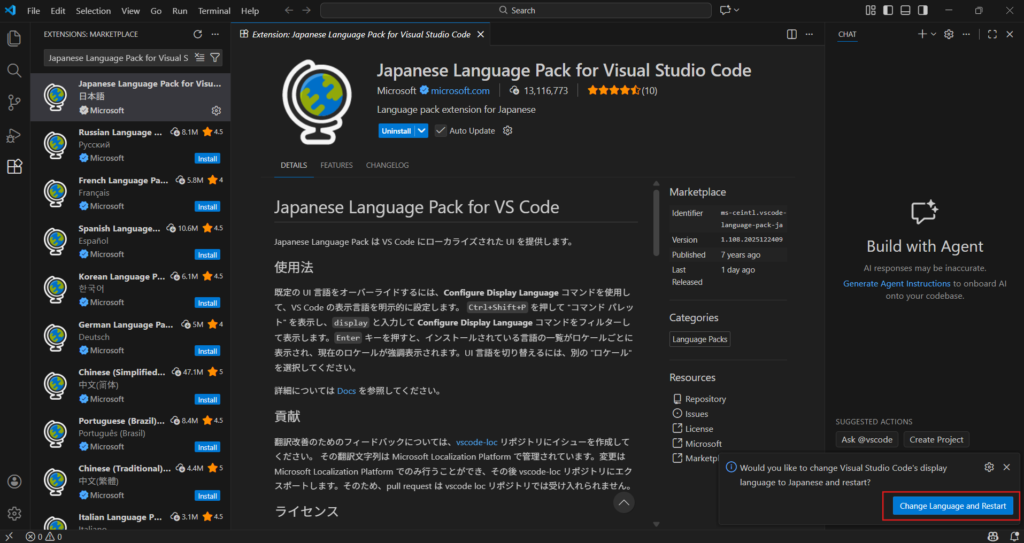 インストールが完了したら、画面右下に表示される「Change Language and Restart」というボタンをクリックします。