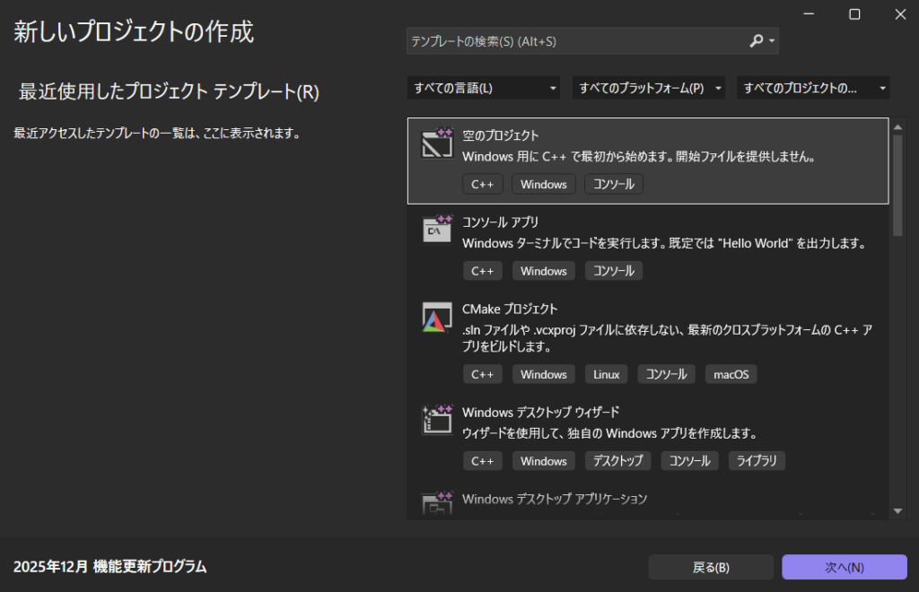 今回はC言語の開発をしたいので「C++によるデスクトップ開発」を選択しています。右に表示されている画面からさらにオプションを選択することも可能ですが、とりあえずそのままでOKです。