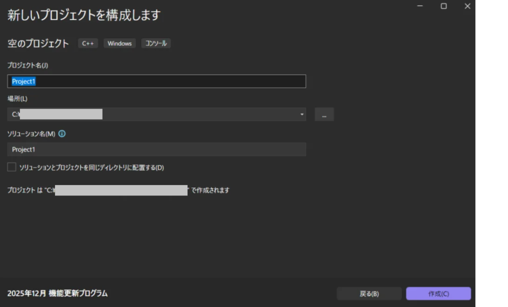 プロジェクト名や、プロジェクトの保存場所の設定画面が表示されます。