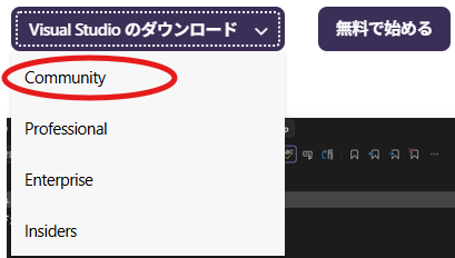 「Visual Studio のダウンロード」のプルダウンをクリックすると選択肢が表示されます。それぞれ意味は次の通りです。
