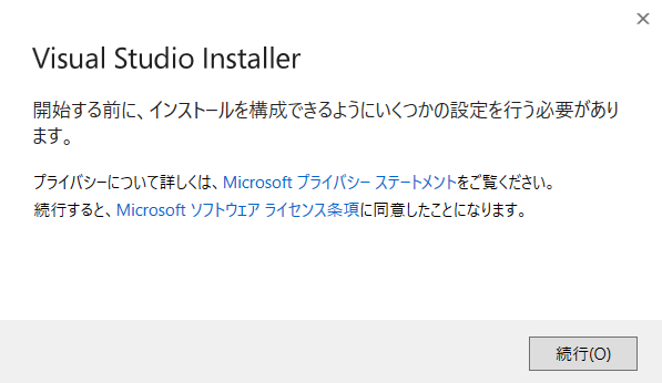 「VisualStudioSetup.exe」というファイルがダウンロードされるので、ダブルクリックして実行します。