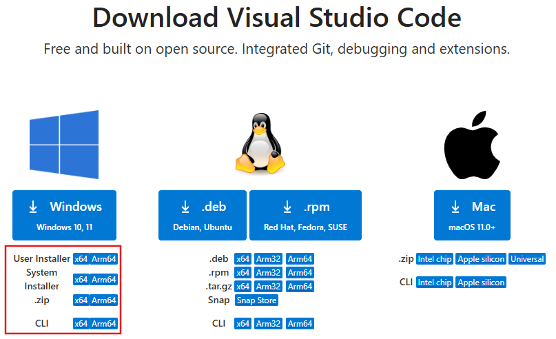 VS Codeの公式サイトのダウンロードページ(https://code.visualstudio.com/Download)からWindows版のインストーラーを入手しようとすると、以下の赤枠の選択肢があります。