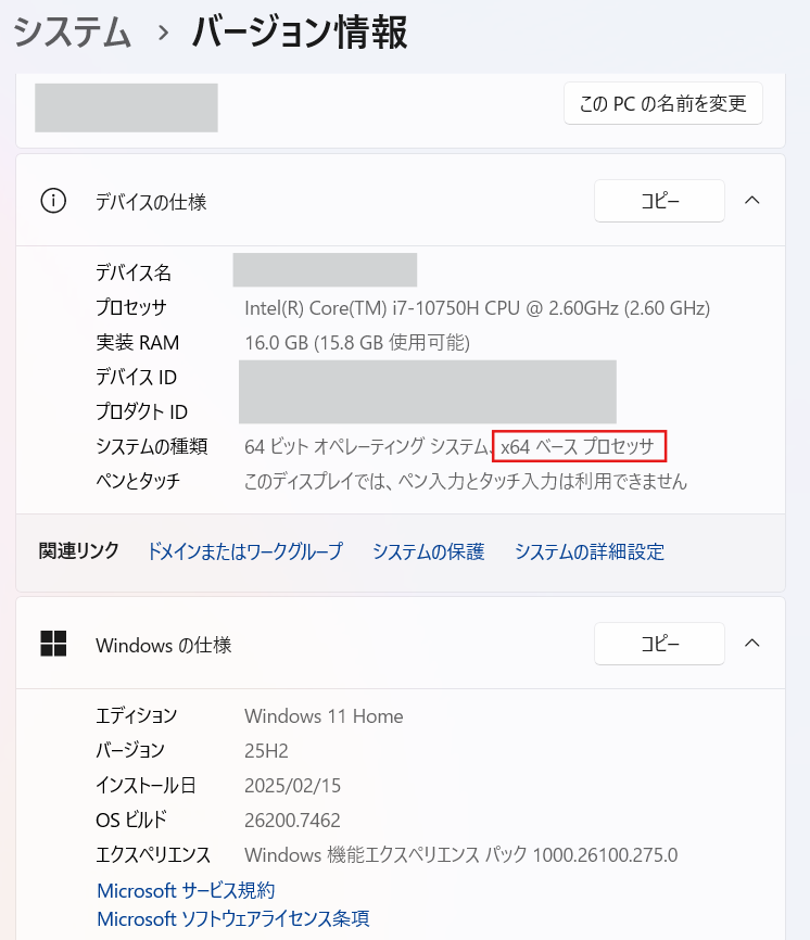 自分のPCの場合、赤枠の記載からx64であることが確認できました。