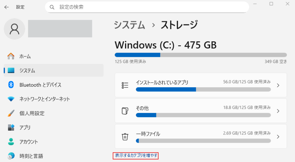 このままだとすべての内訳は表示されていないので「表示するカテゴリを増やす」をクリックします。