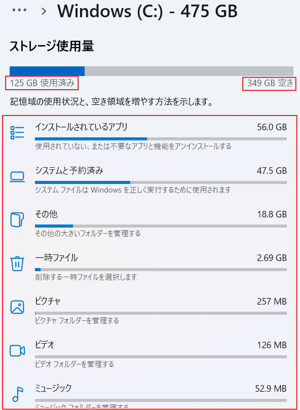 もし赤く表示されていたり、空き容量が少ない場合は、